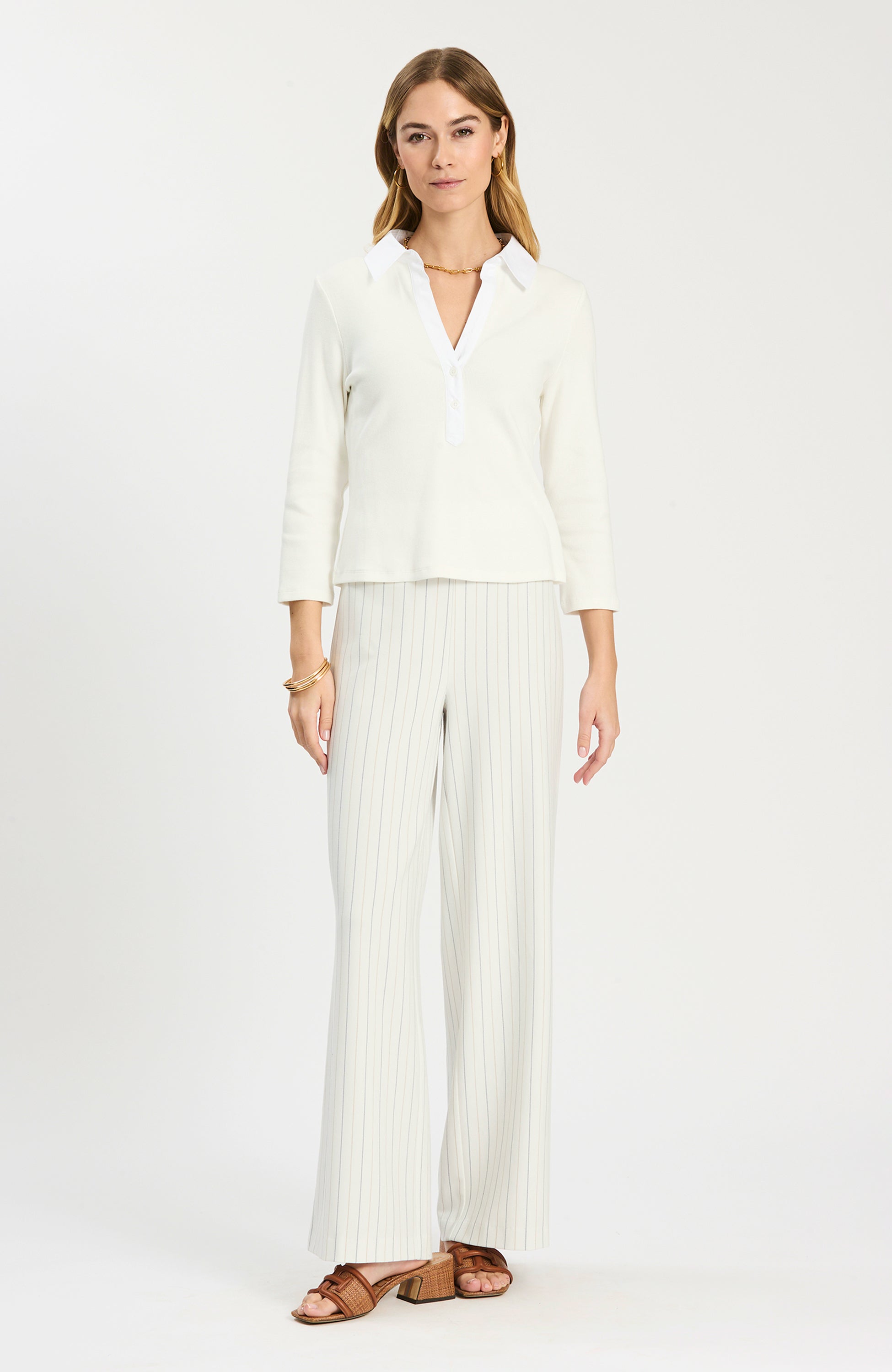 Meet your new go-to essential: the Poppy Ribbed Collar Tee. Cut from a soft, stretchy rib knit, it features a polished collared V-neck placket with tonal buttons and three-quarter sleeves. The slightly cropped, relaxed fit pairs effortlessly with high-rise denim, pants, or skirts—cute enough for plans, comfy enough for everyday.