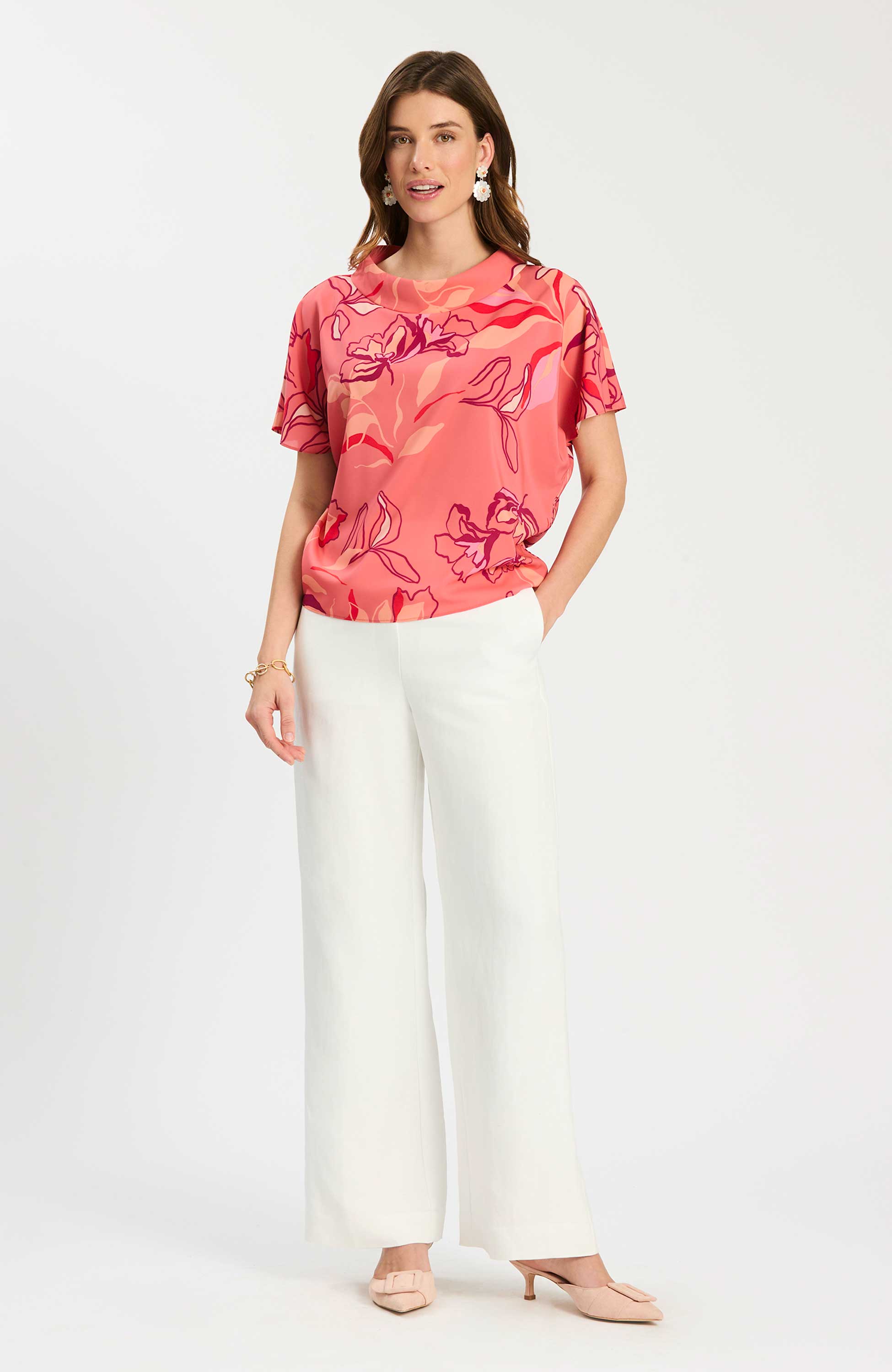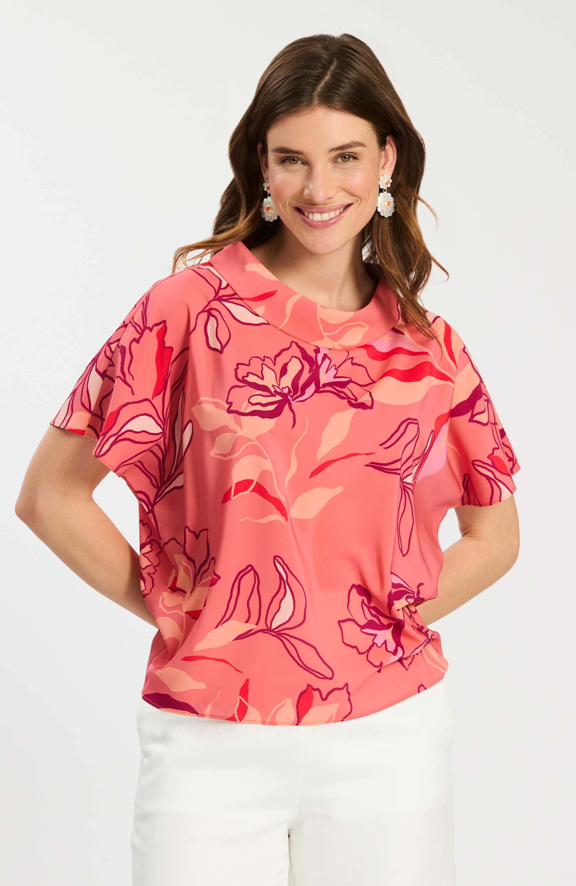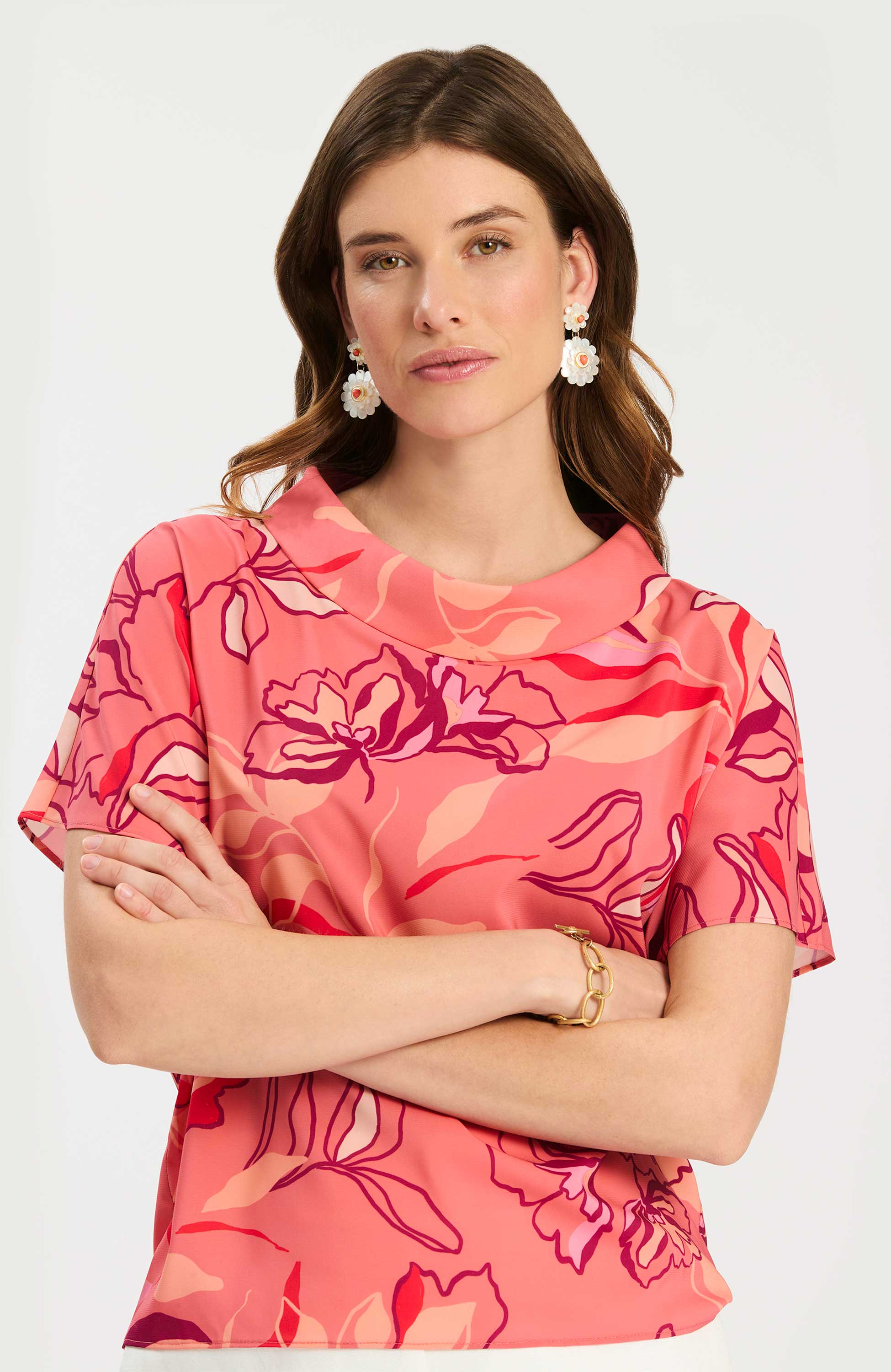 The Mary Peachy Floral Topper in this exclusive print is one of those pieces that instantly makes an outfit feel more put together. Cap sleeves with relaxed arm opening gives it a clean, streamlined silhouette. Featuring a soft roll-neck that make any look feel instantly polished. Consider it your go-to—fresh, flattering, and forever stylish.