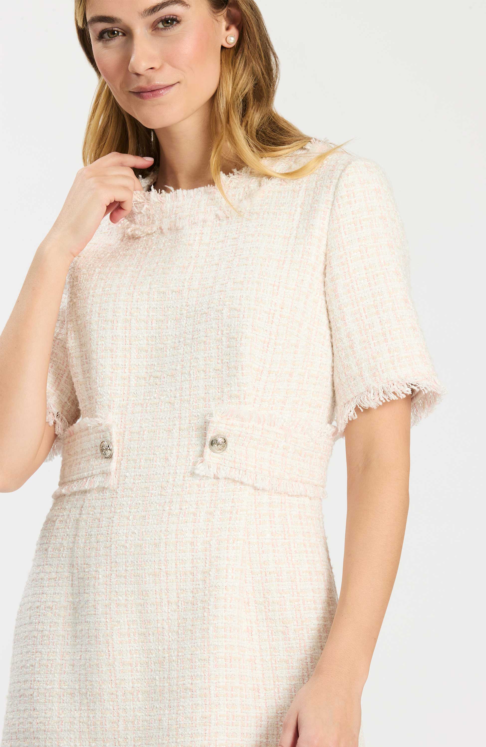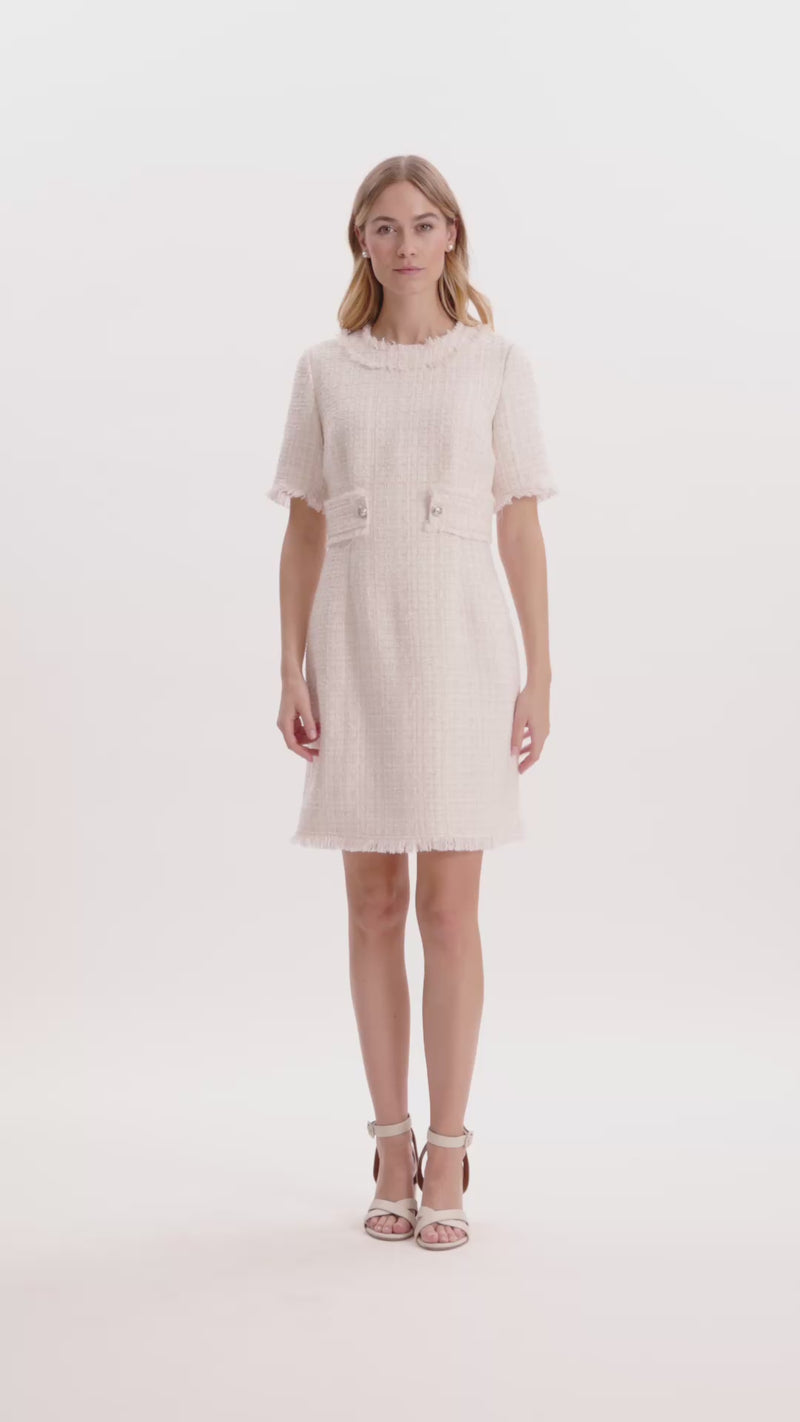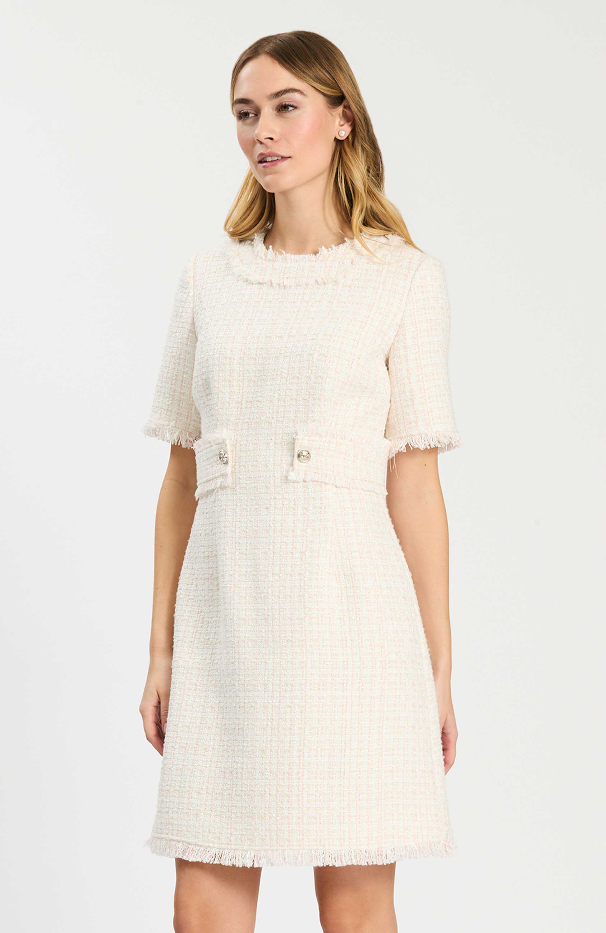 This bouclé dress is all about refined texture and timeless detail. Crafted in a softly structured bouclé fabrication, it features delicate woven dimension throughout that gives the piece its elevated, polished feel. Subtle trim accents add a thoughtful finishing touch, while the clean silhouette keeps it classic and easy to wear. Effortless yet sophisticated, this is the kind of dress that works beautifully for daytime events and transitions seamlessly into evening with just a change of accessories.