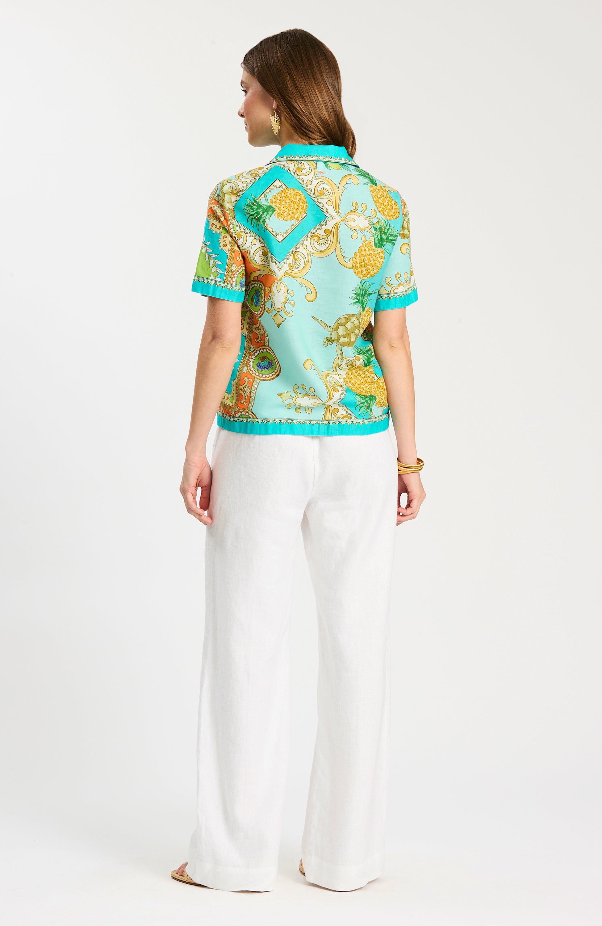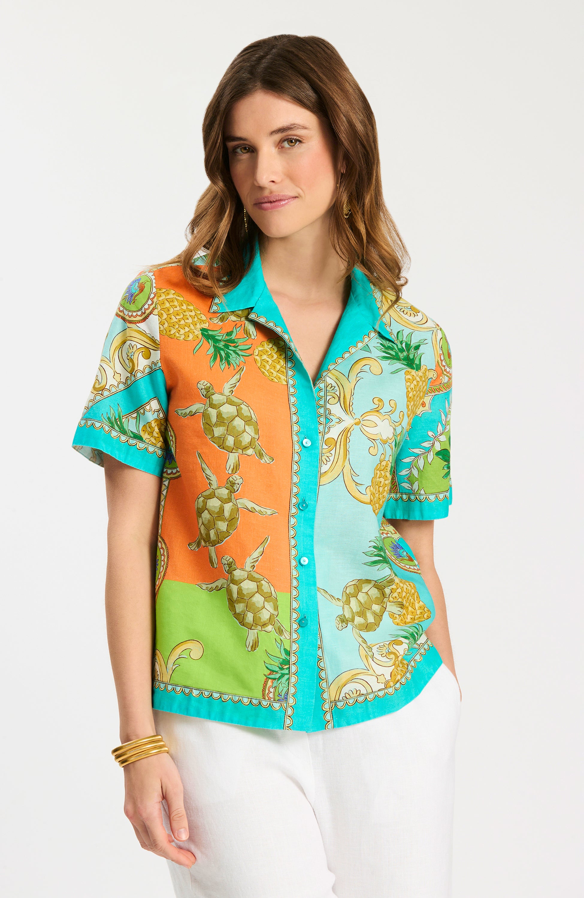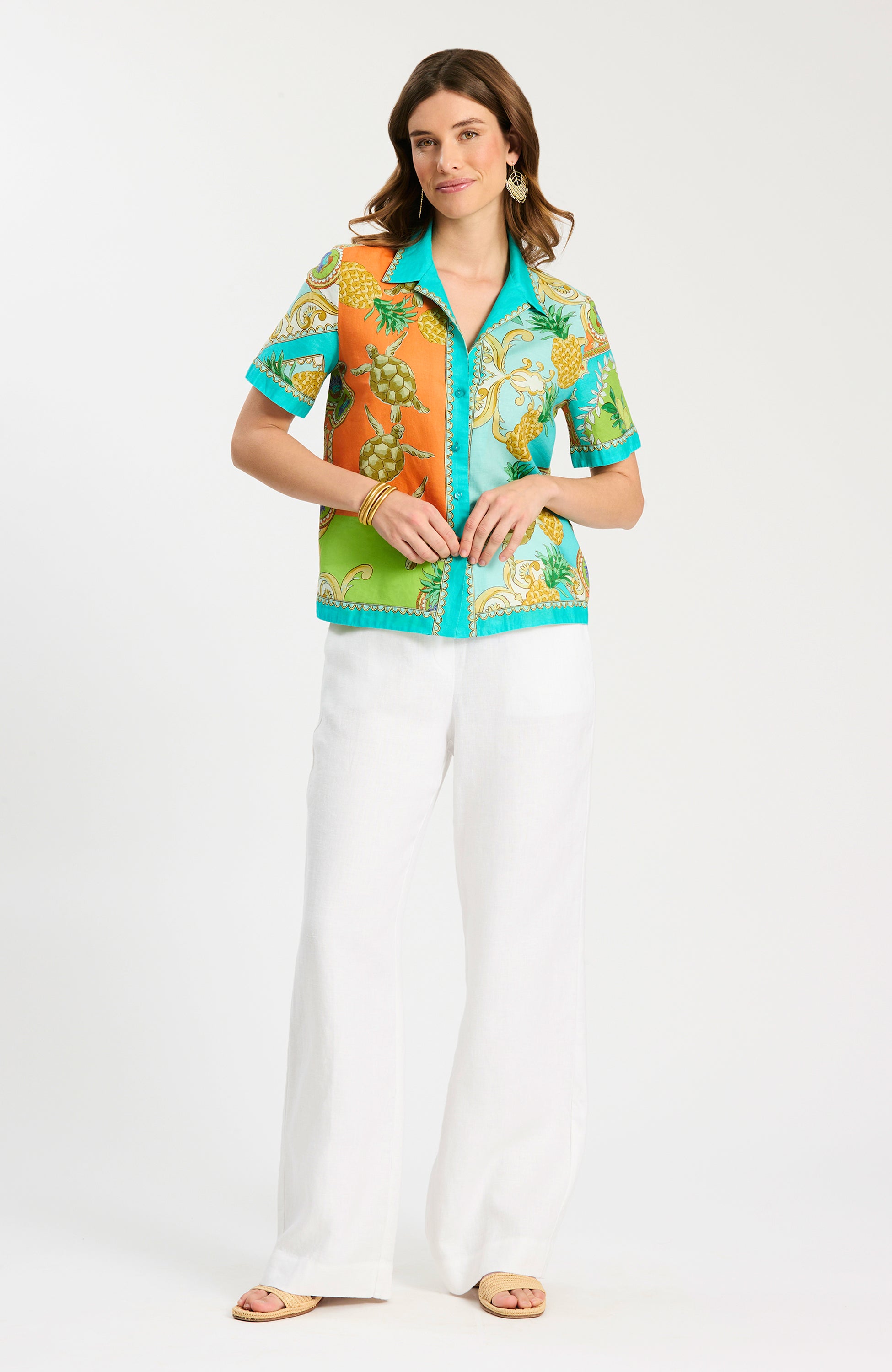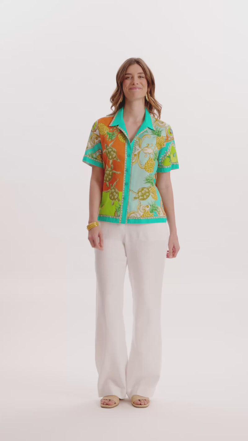An instant statement in our exclusive Positano print, the Corbin Camp Shirt brings bold color and effortless polish to warm-weather dressing. Crafted in a breathable linen-cotton blend, this relaxed button-front silhouette features a classic collar and short sleeves for an easy, laid-back feel. Whether worn as a standout separate or paired with the matching Gianna Pant as a set, this piece is perfect for vacation days, weekend plans, and sunny escapes.