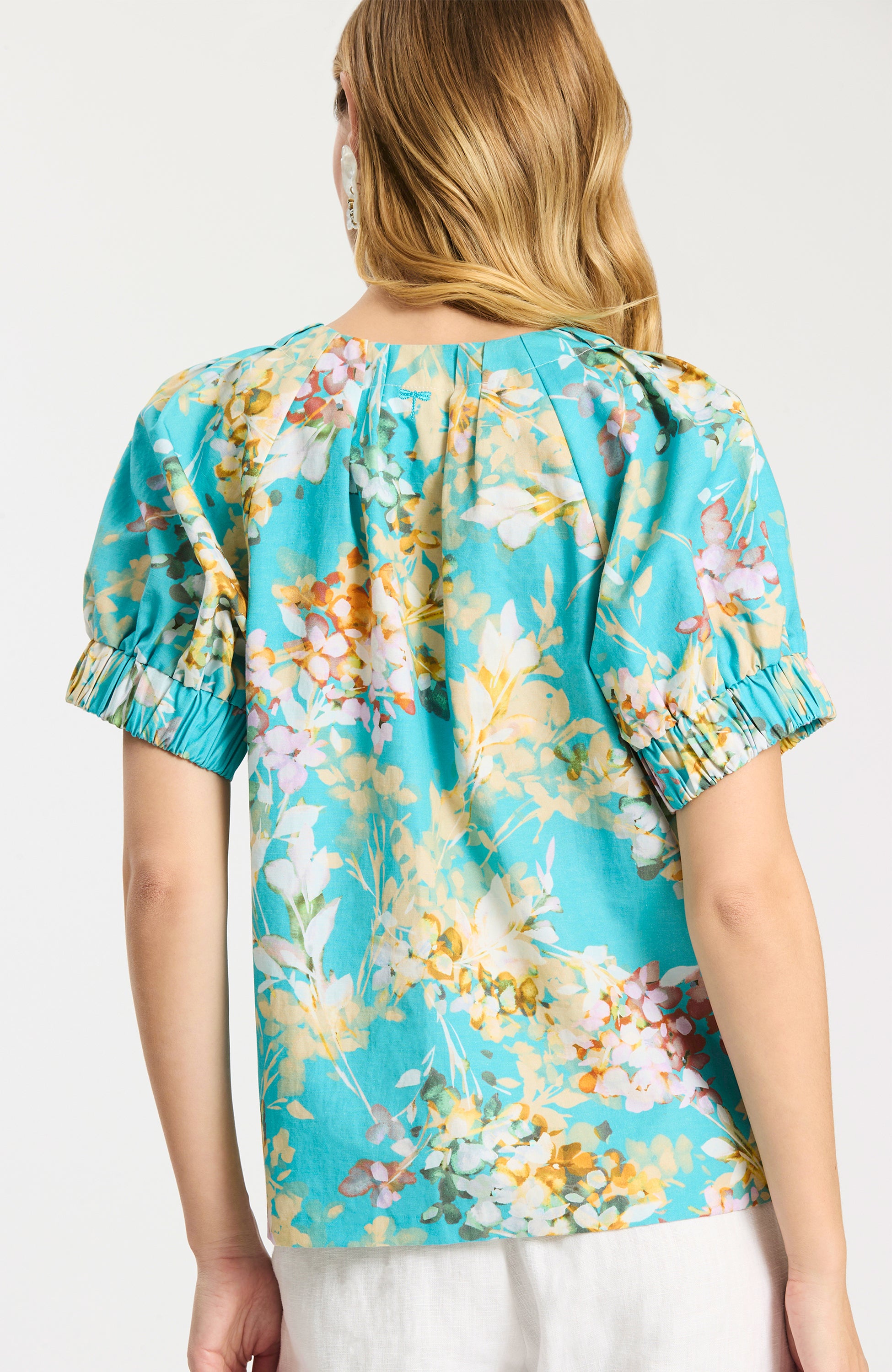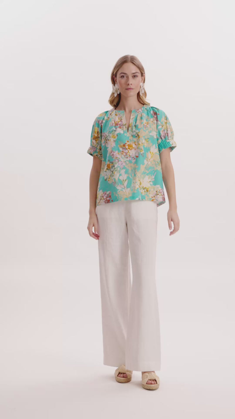 A cheerful pop of color in our exclusive Tossed Floral print, the Skyler Top is designed to brighten your everyday wardrobe. Crafted in a lightweight linen-cotton blend, this easy blouse features a relaxed silhouette with a notched round neckline and softly puffed short sleeves, making it effortlessly wearable from morning errands to warm-weather gatherings. Style it with crisp white denim or linen pants for a spring look that feels both fresh and timeless.