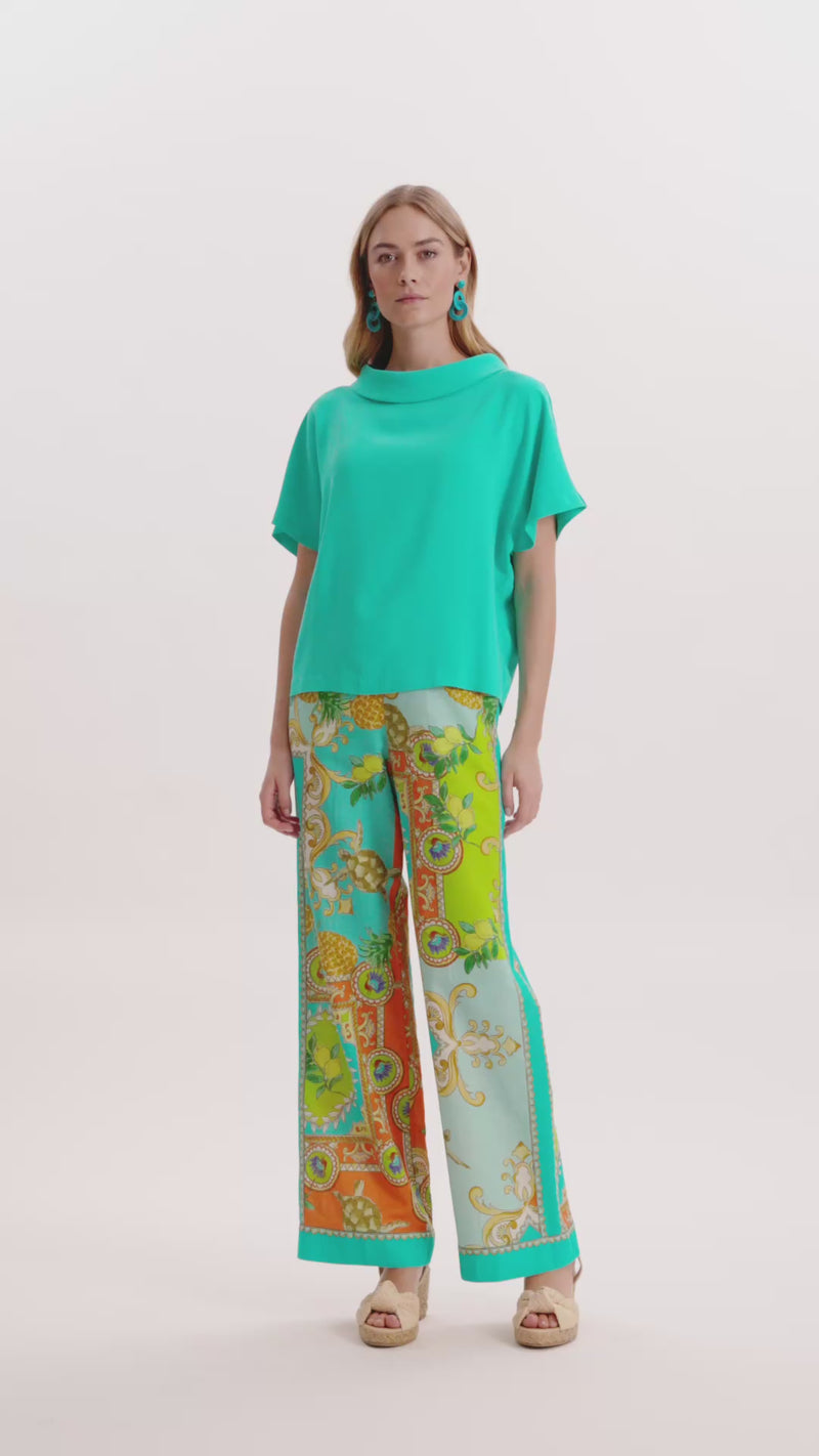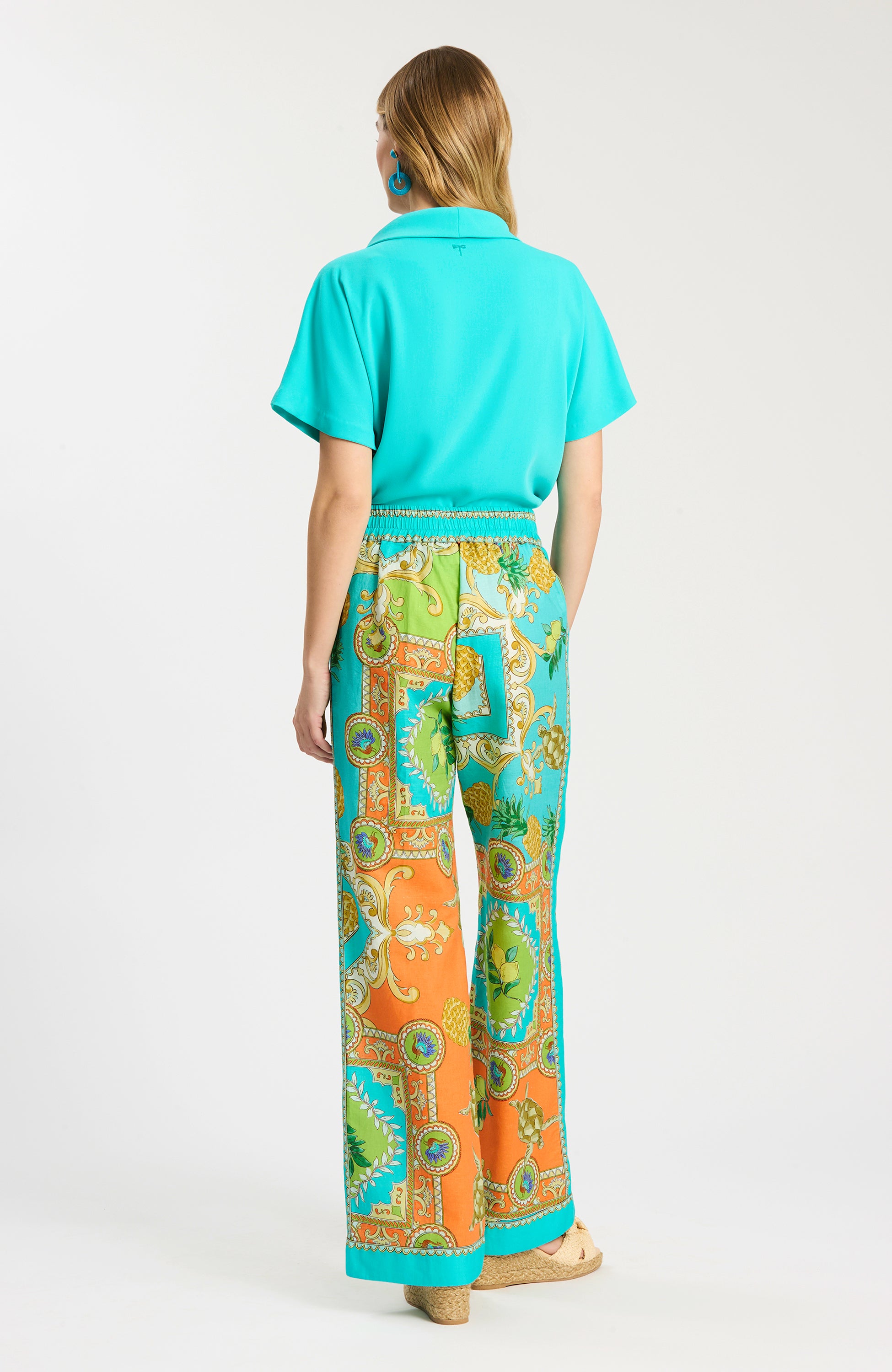 A statement pant in our exclusive Positano print, designed to bring bold color and effortless polish to warm-weather dressing. Crafted in a breathable cotton-linen blend, Gianna has an easy pull-on silhouette with a flattering straight leg that moves beautifully from sunny days to vacation dinners and everything in between. We love it styled with the Mary Topper or paired with the matching Corbin Camp Shirt for a chic, coordinated set.