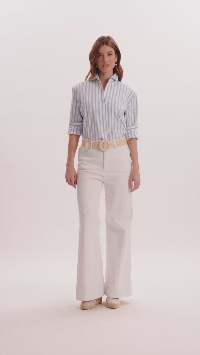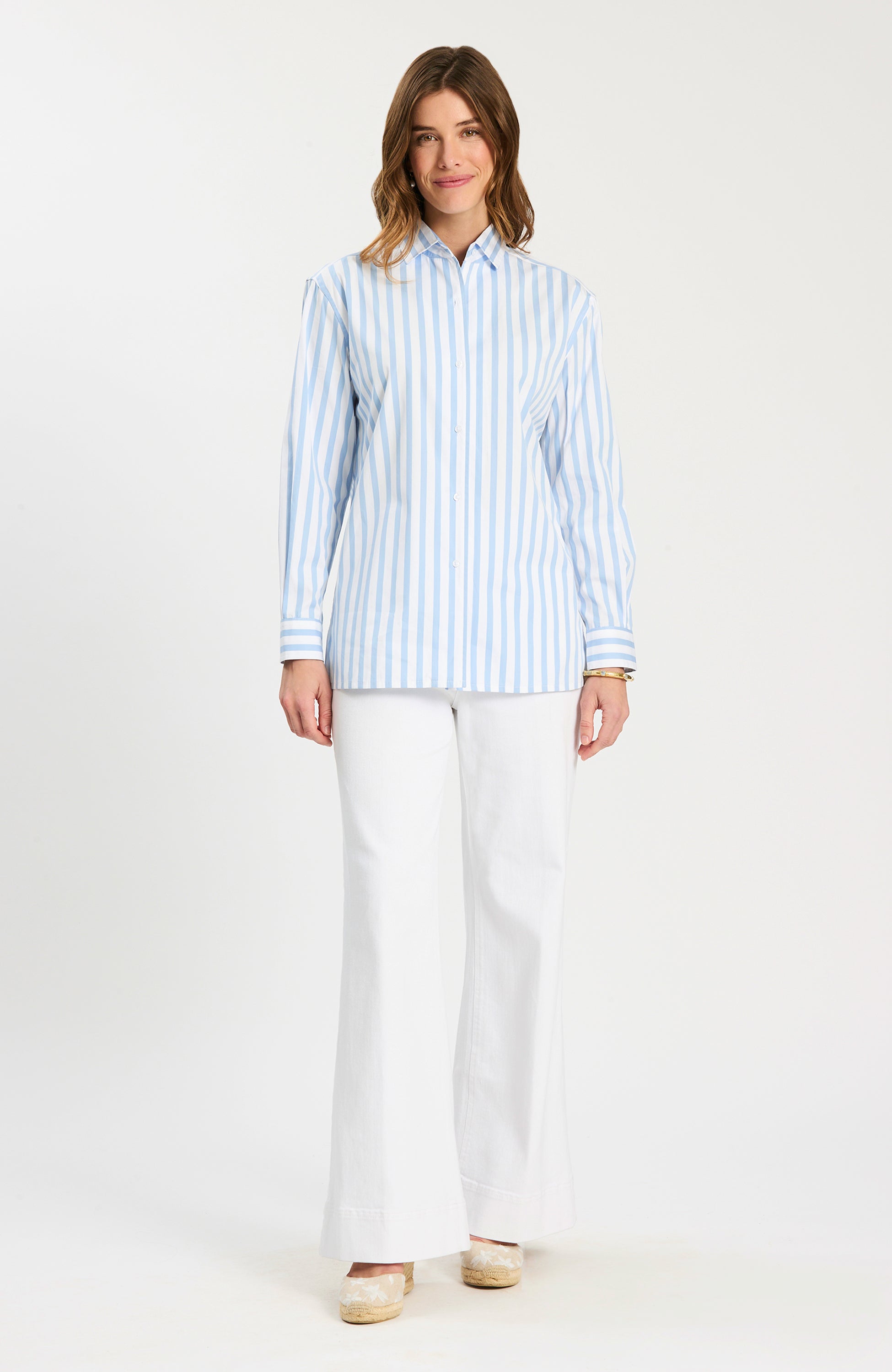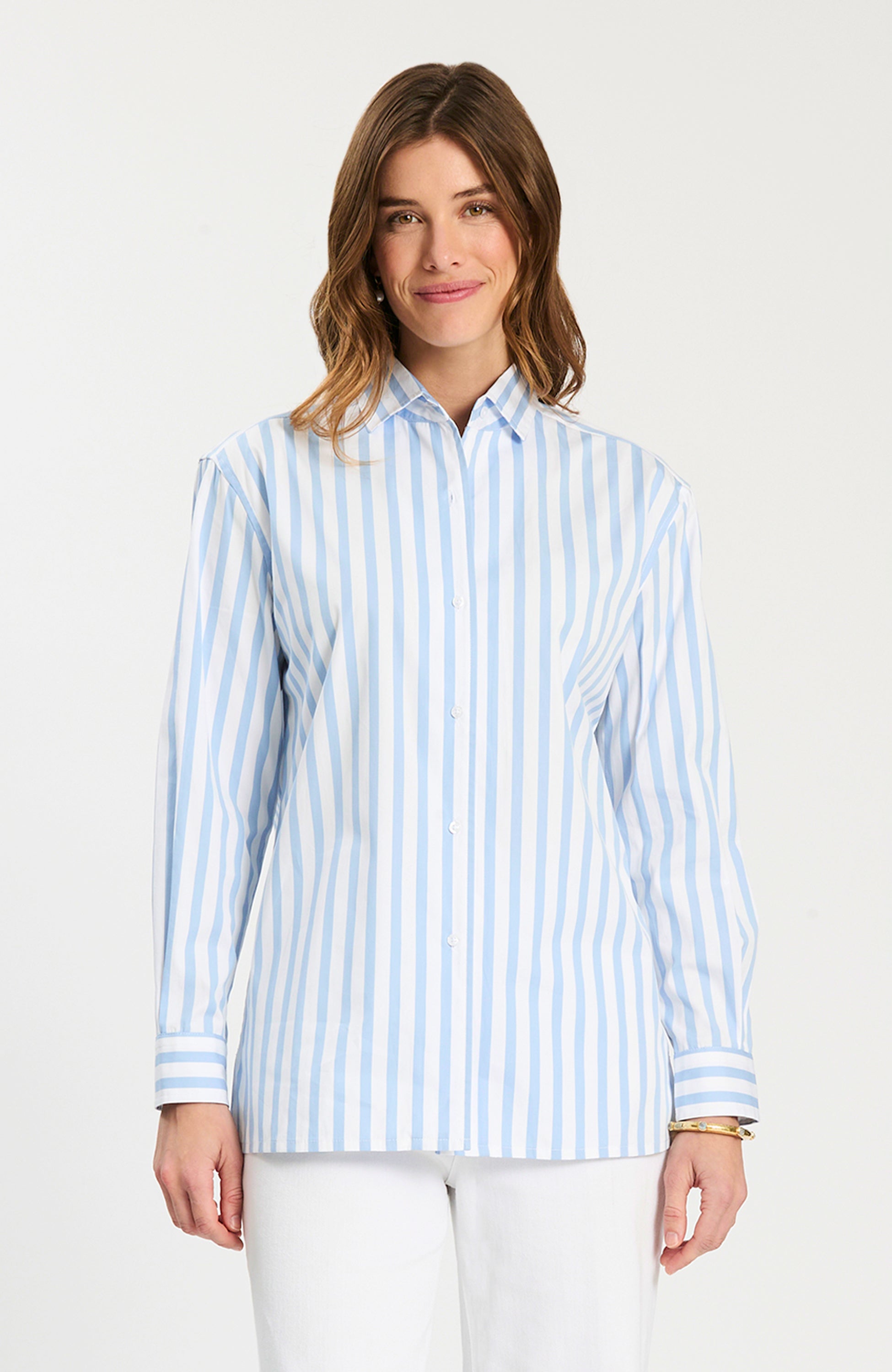 This cotton striped button-down is a fresh, polished take on a timeless classic. Designed with crisp vertical stripes, it creates a clean, flattering look while maintaining an easy, tailored fit. The lightweight cotton fabrication keeps it breathable and comfortable, making it perfect for all-day wear. Finished with a classic collar and button-front closure, it’s an effortless staple—perfect worn on its own or layered for a more refined, pulled-together look.