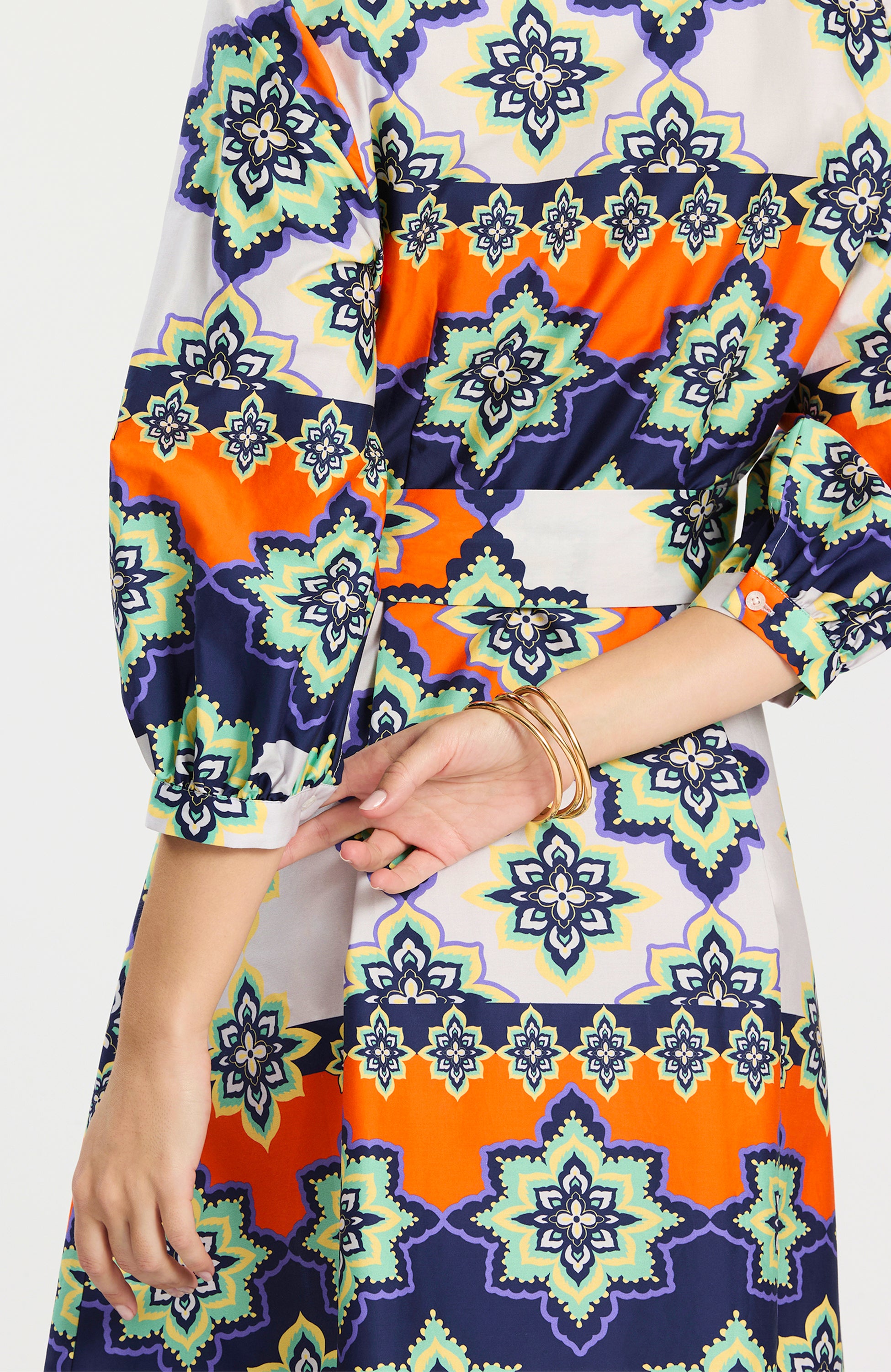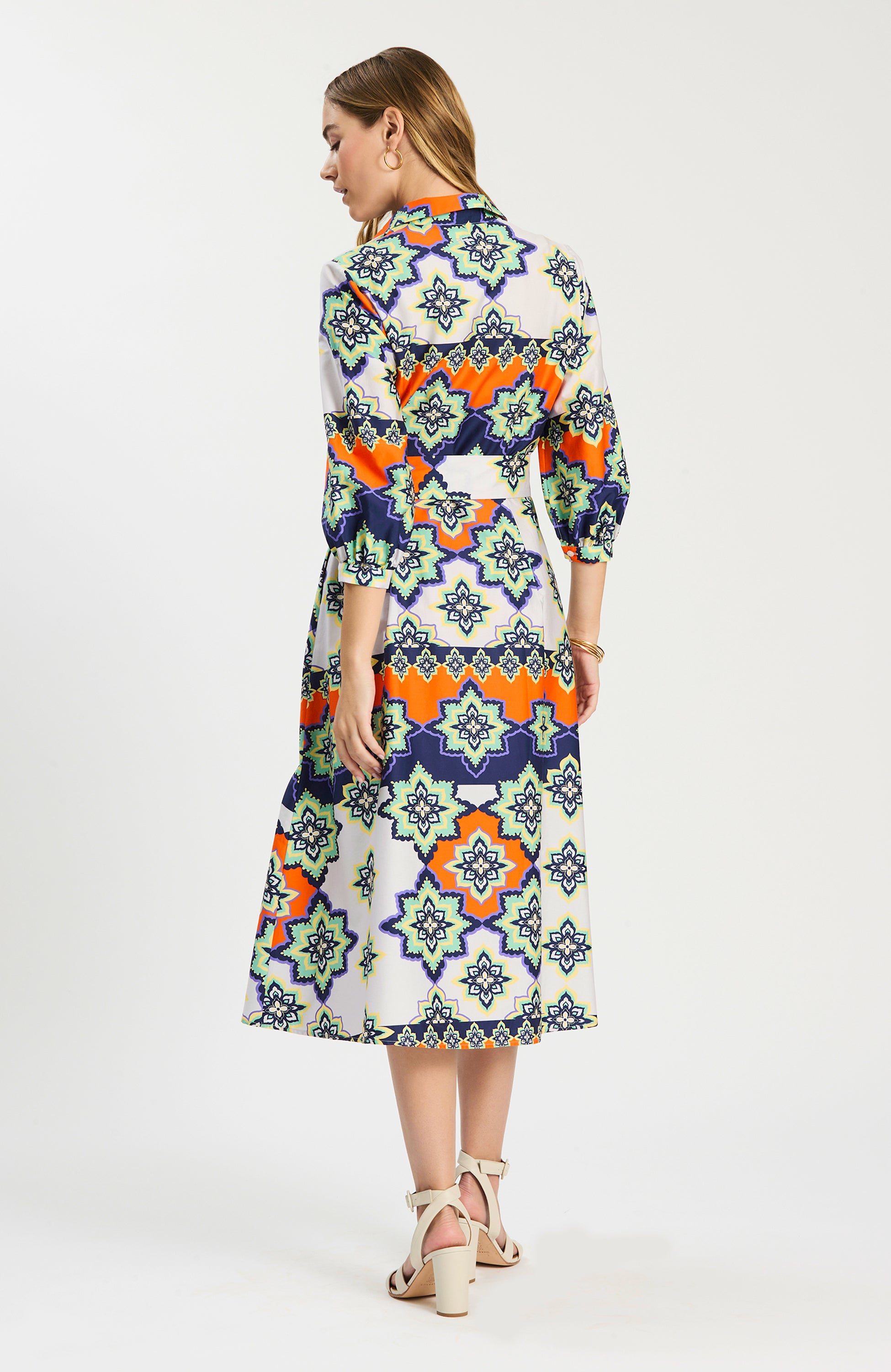 This standout midi dress is designed to make getting dressed effortless and memorable. Featuring a vibrant, artistic print layered with bold florals and geometric motifs, it brings color and personality to a timeless silhouette. The relaxed shape and flattering length make it easy to wear, while the three-quarter sleeves add polish and versatility. Style it with a sandal or heel for daytime events, then dress it up with statement jewelry for evening—this is the kind of piece that does all the work for you.