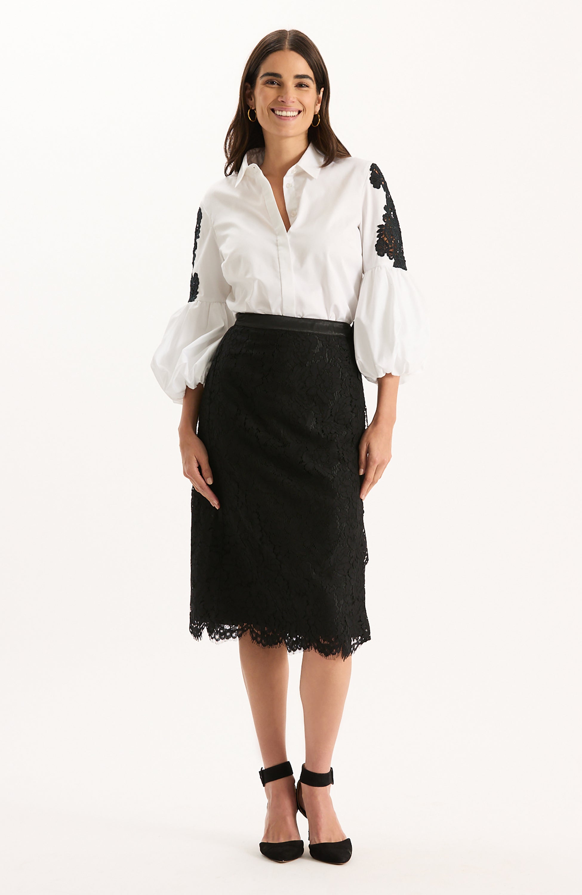 This crisp white button-down is elevated with black lace appliqué accents along the sleeves, creating a bold contrast that exudes modern elegance. Crafted from a structured cotton blend, it offers a polished yet feminine silhouette perfect for both day and evening occasions.
