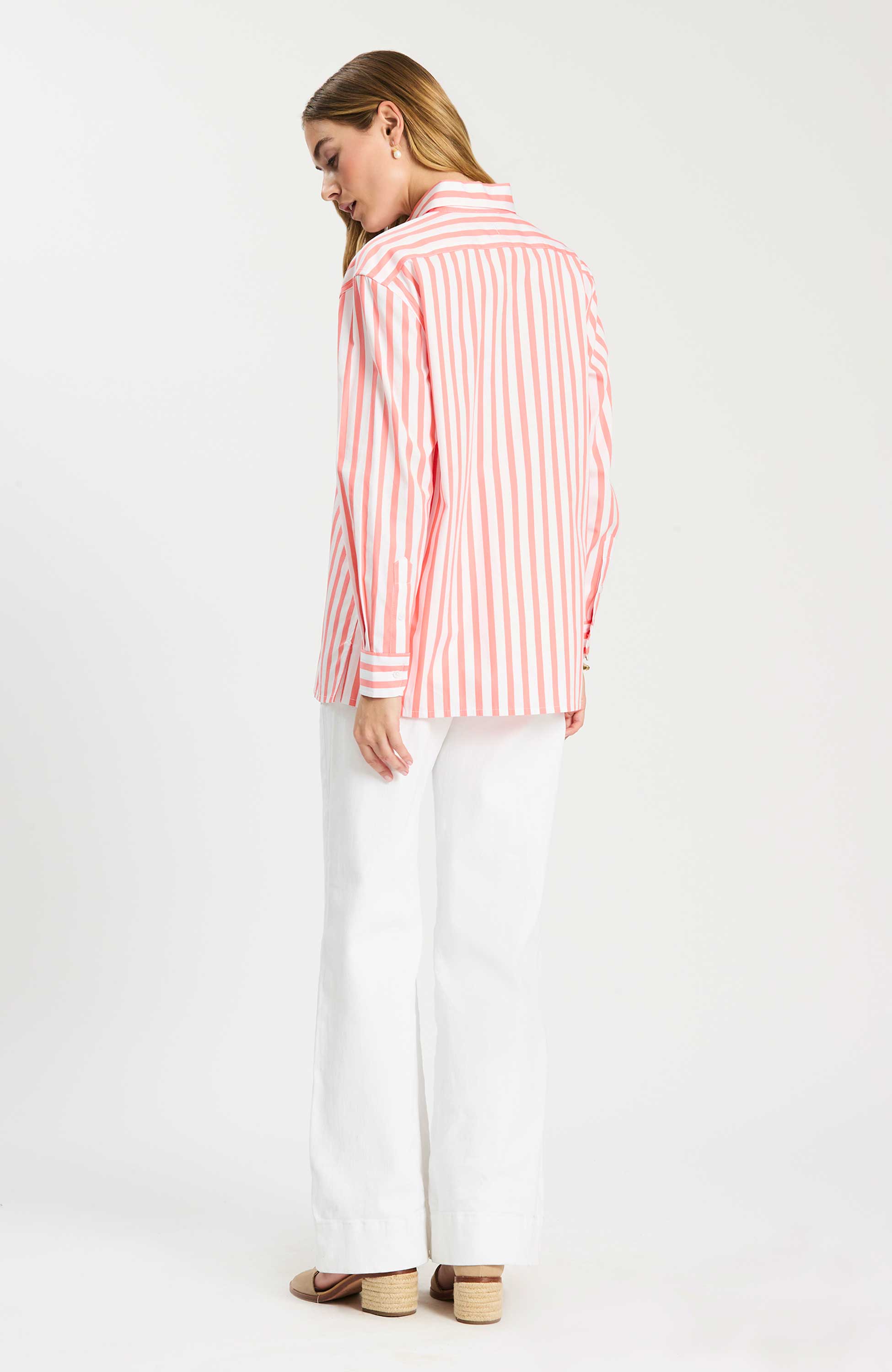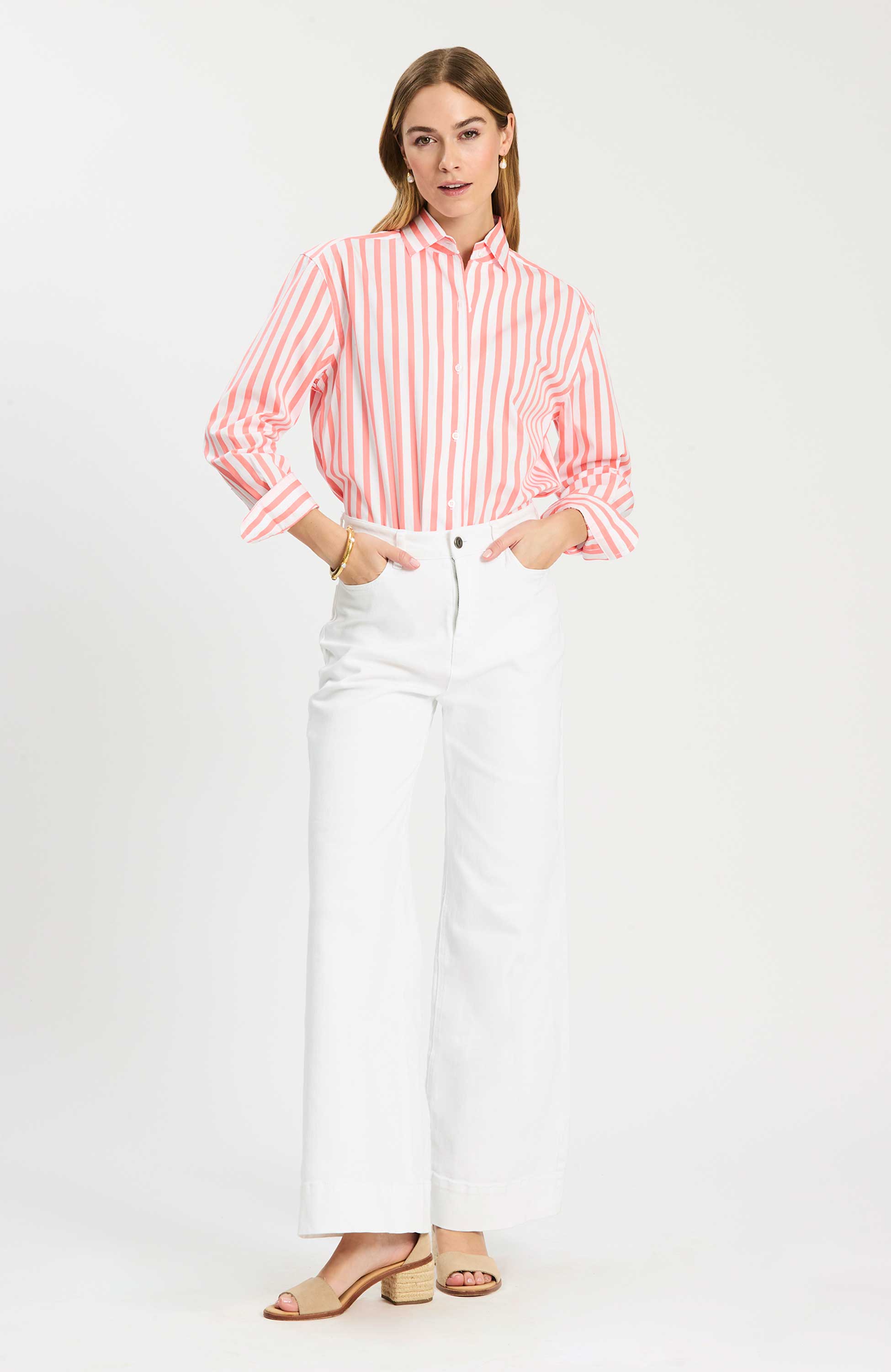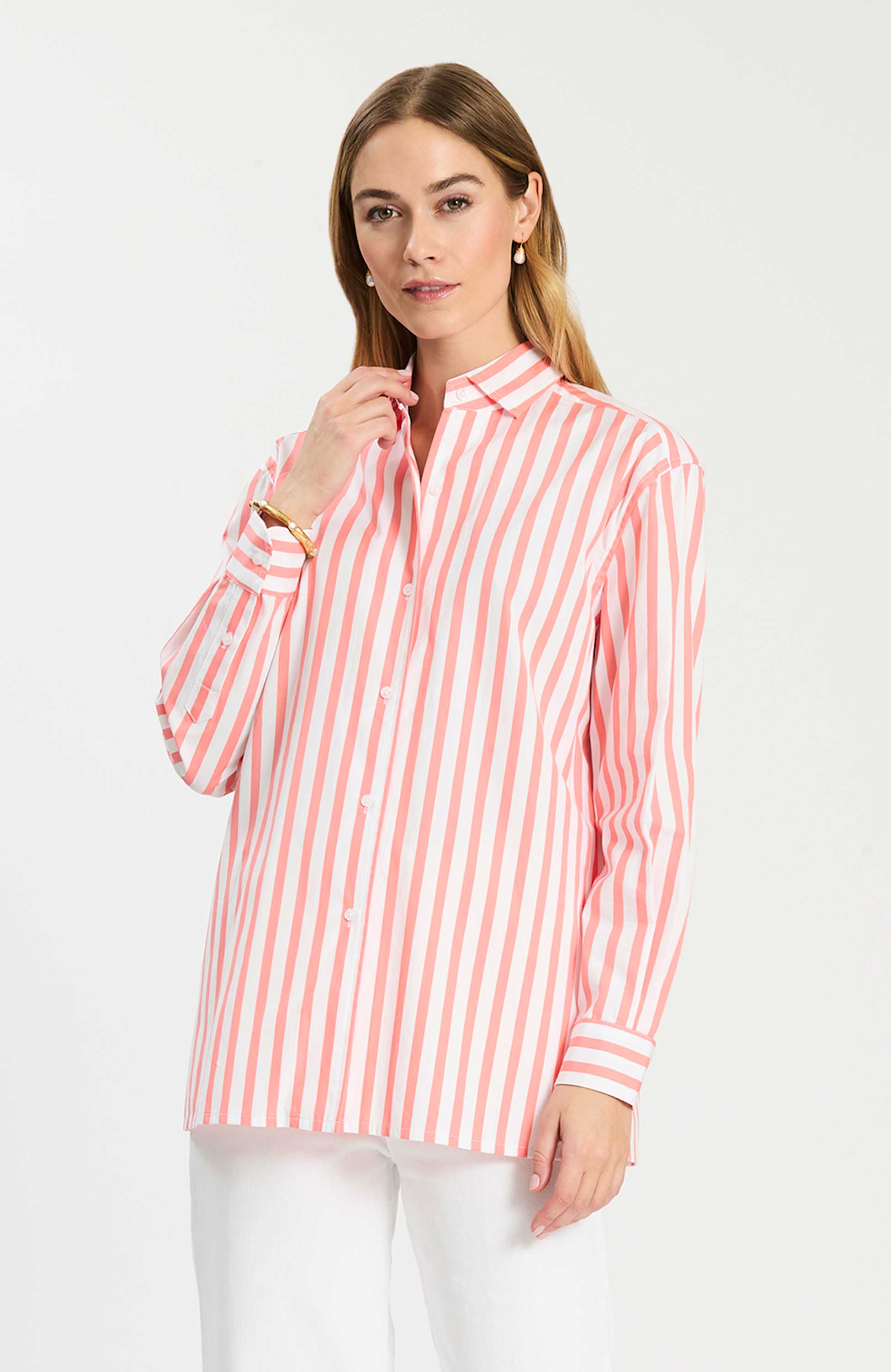 This cotton striped button-down is a fresh, polished take on a timeless classic. Designed with crisp vertical stripes, it creates a clean, flattering look while maintaining an easy, tailored fit. The lightweight cotton fabrication keeps it breathable and comfortable, making it perfect for all-day wear. Finished with a classic collar and button-front closure, it’s an effortless staple—perfect worn on its own or layered for a more refined, pulled-together look.