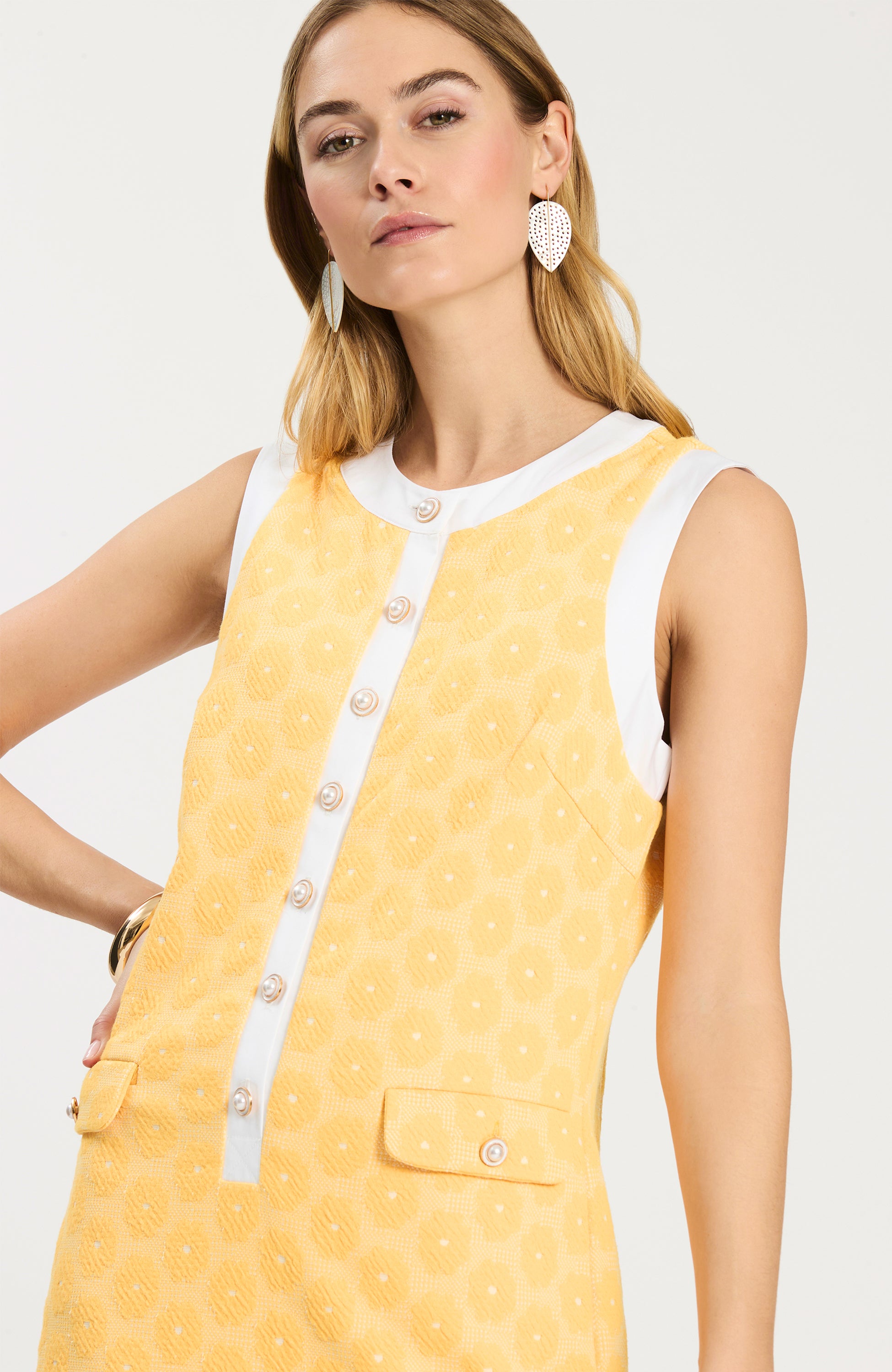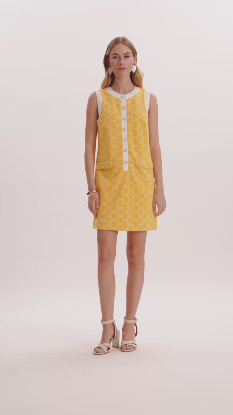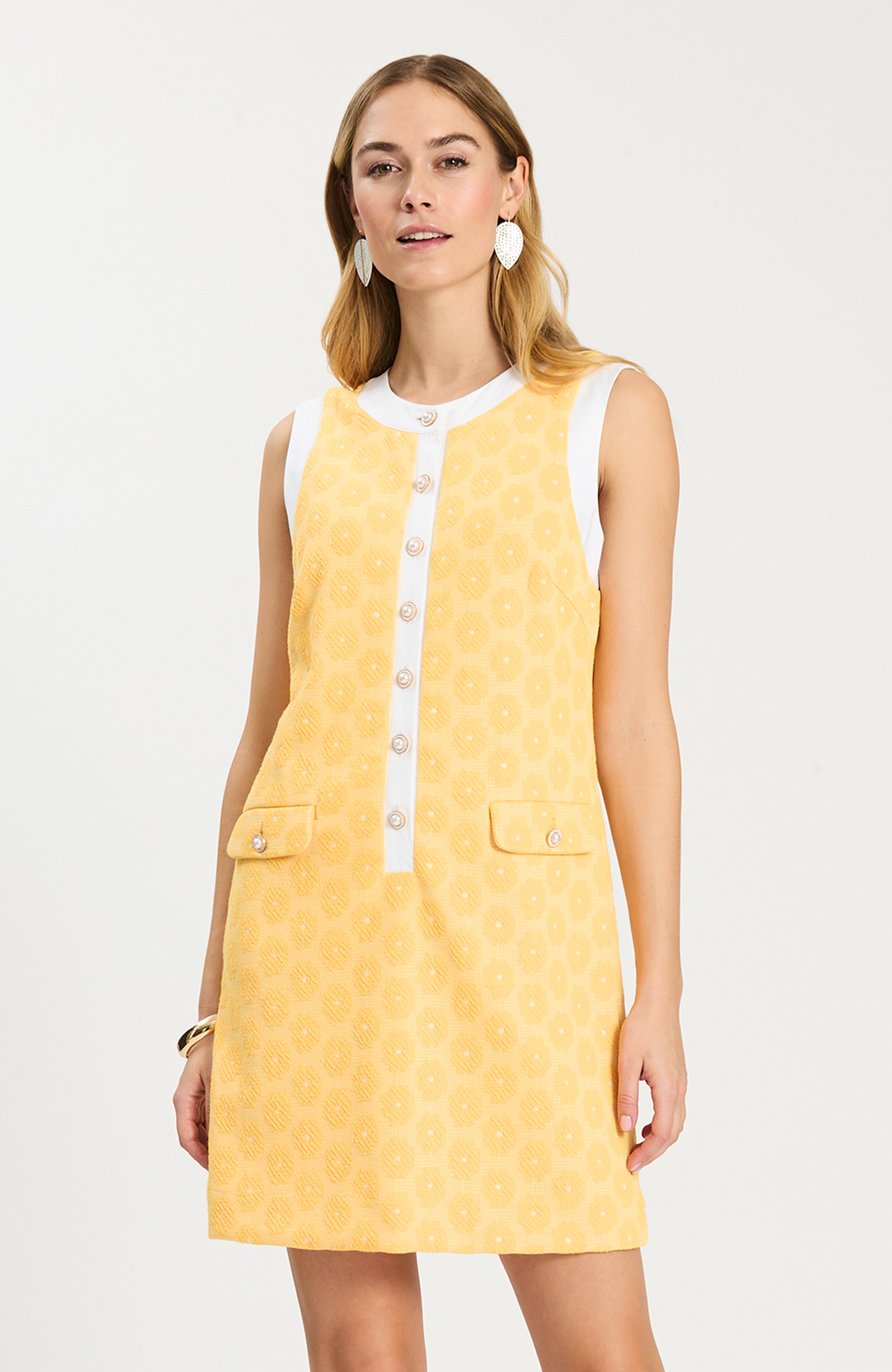 Meet Kirk! The newest addition to our best-selling Knit Girls collection, this cheerful sleeveless dress is designed in a textured knit with pearl button details and crisp contrast trim for a fresh, polished feel. Effortless yet pulled together, it’s the perfect warm-weather style for everything from daytime events to vacations and summer soirées. Pair it with sandals or wedges for an easy, elevated look. Featured here in our Pale Marigold/White floral pattern.