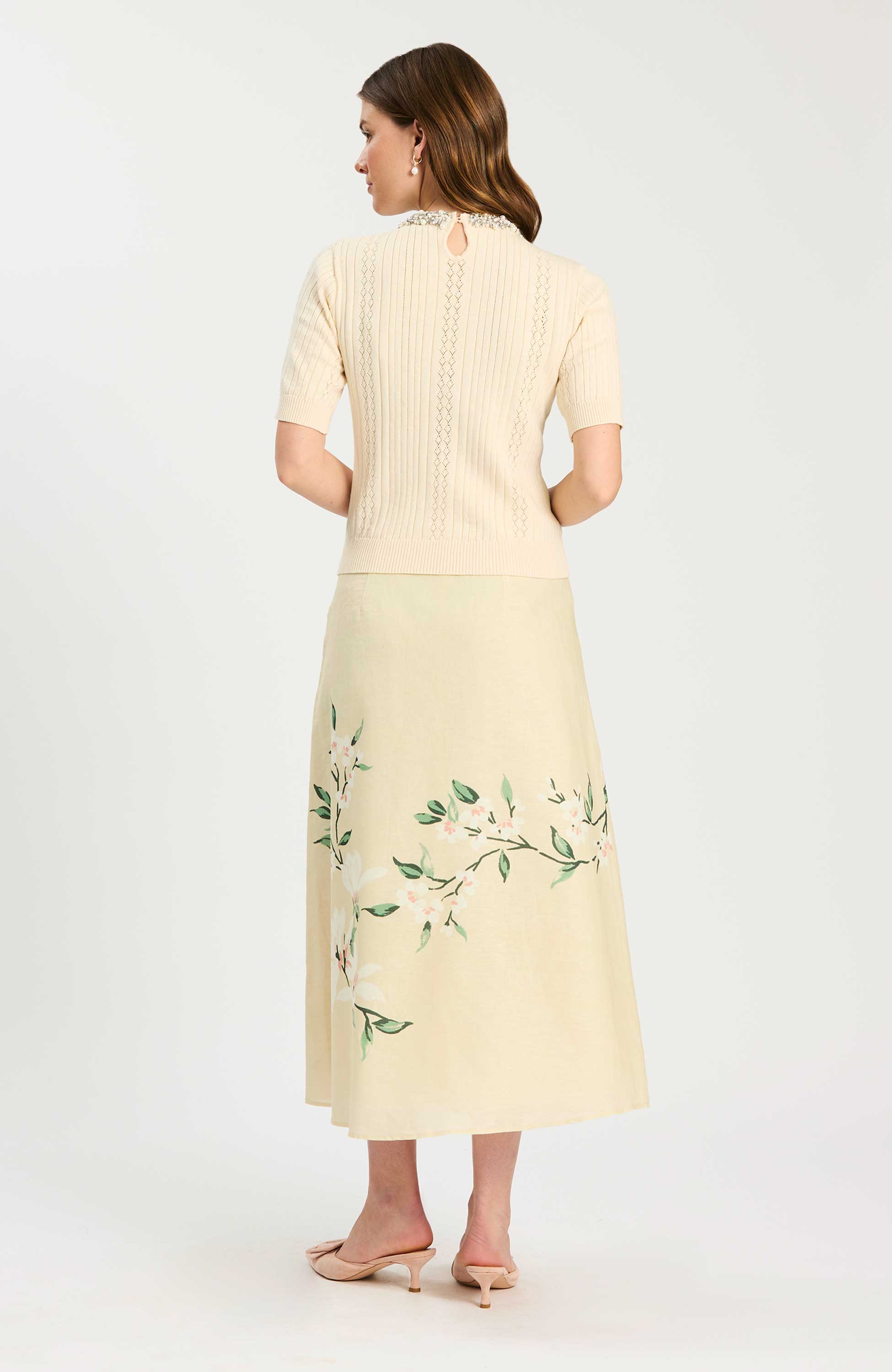 This feminine knit is a refined take on an everyday essential. Designed with delicate pointelle detailing throughout, it features an elegant mix of pearls and subtle crystal embellishments along the neckline for just the right amount of polish and sparkle. The short sleeves and classic crew silhouette keep it timeless and easy to wear, while the lightweight knit makes it perfect for layering or wearing on its own. Effortless yet elevated, this is the kind of piece that instantly dresses up denim or pairs beautifully with a printed skirt for a more polished look.