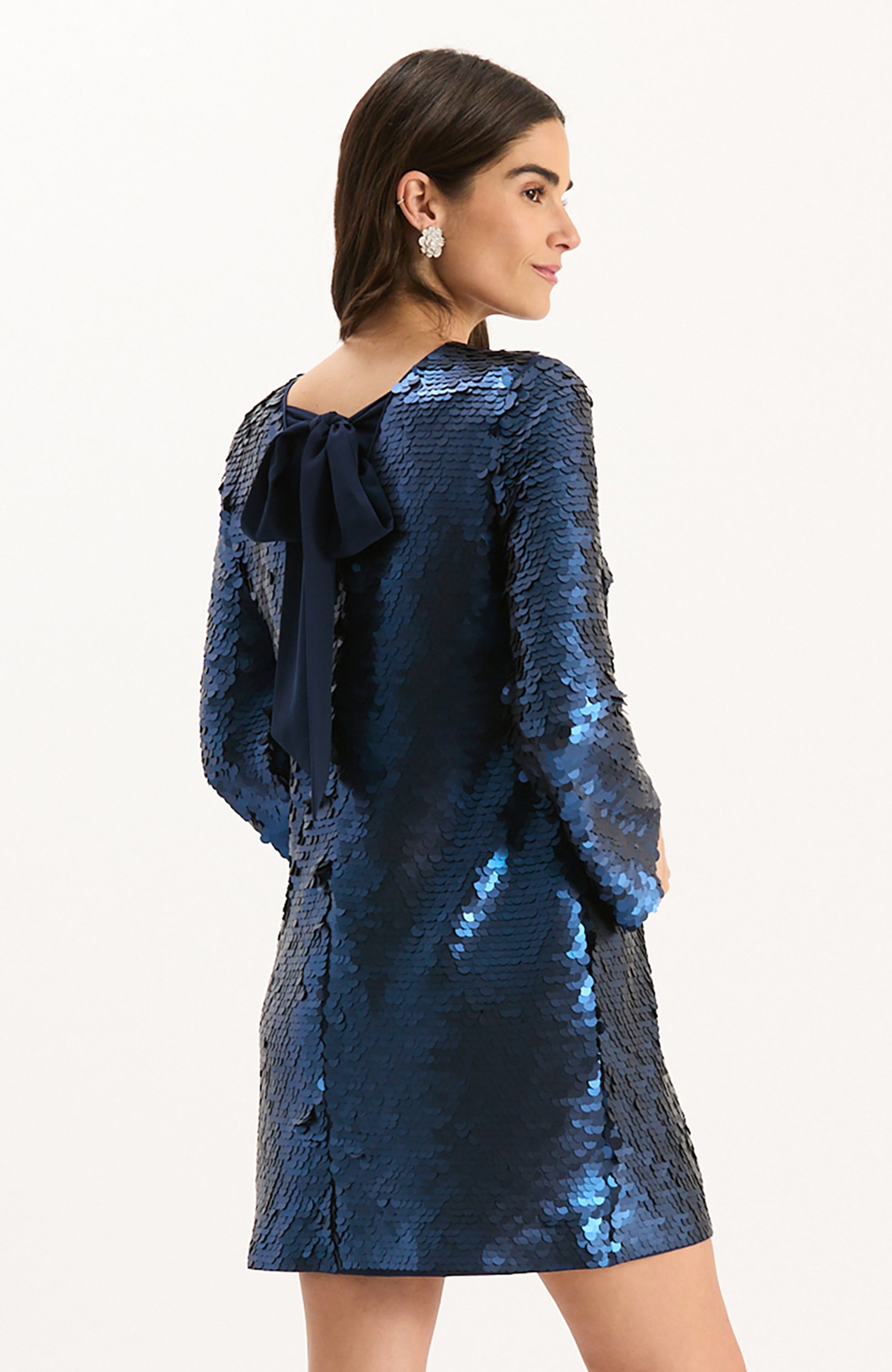 Meet Daphne, your new go-to for making a sparkling entrance this party season. Covered in shimmering blue paillettes that catch the light from every angle, this dress brings instant glamour to any occasion. Designed with a flattering shift silhouette, it features long sleeves, a graceful round neckline, and a statement bow tie detail on the back for a touch of feminine elegance. Perfect for holiday soirées, cocktail parties, or New Year’s celebrations.