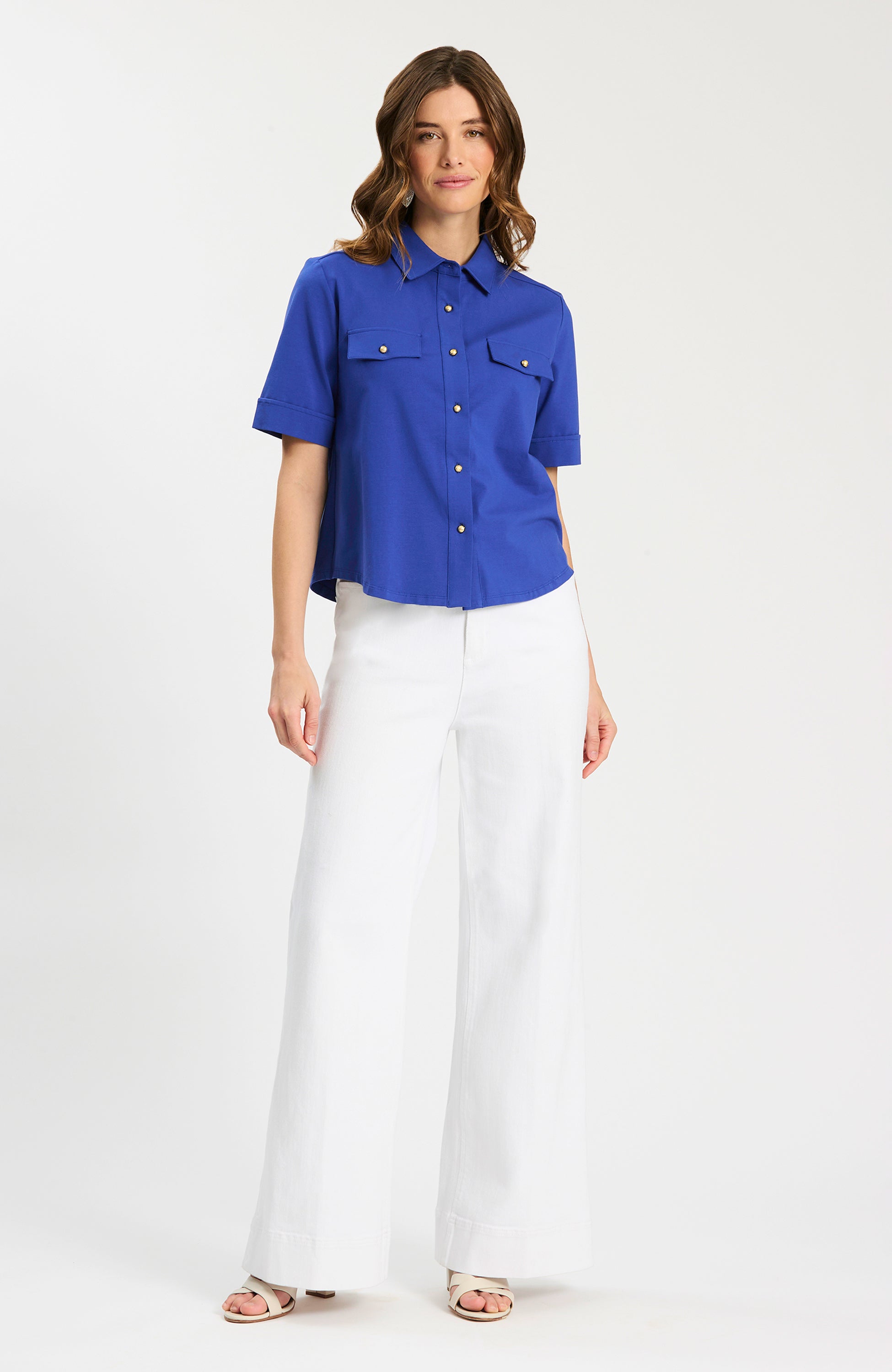 A modern classic you’ll reach for again and again. This short-sleeve button-down is tailored yet effortless, crafted in a comfortable cotton-spandex blend. Chest pockets and gold-tone buttons add a polished finish, while the relaxed silhouette keeps it easy to wear. Perfect for work, weekends, or travel—tucked, untucked, or layered under your favorite jacket.