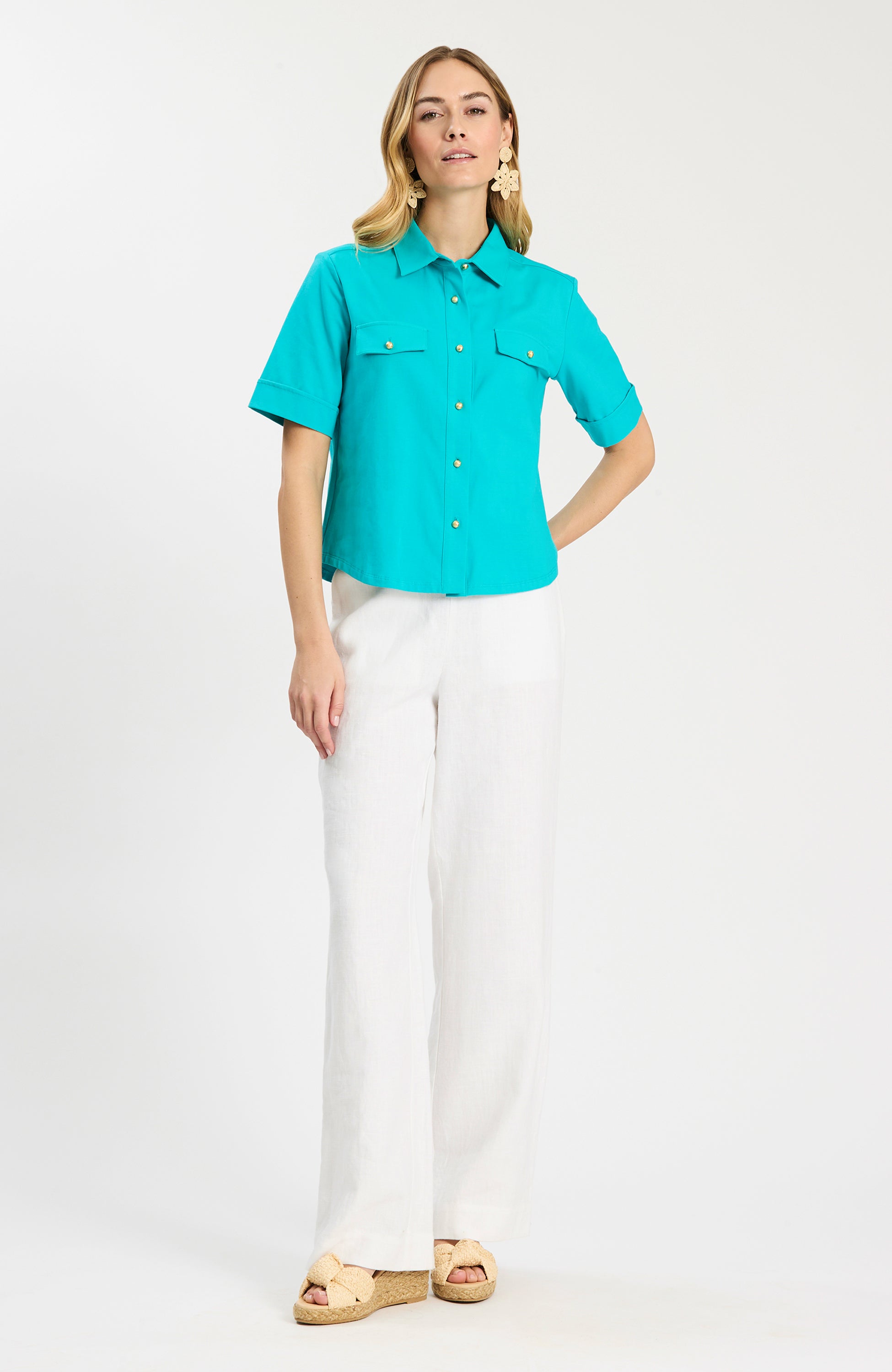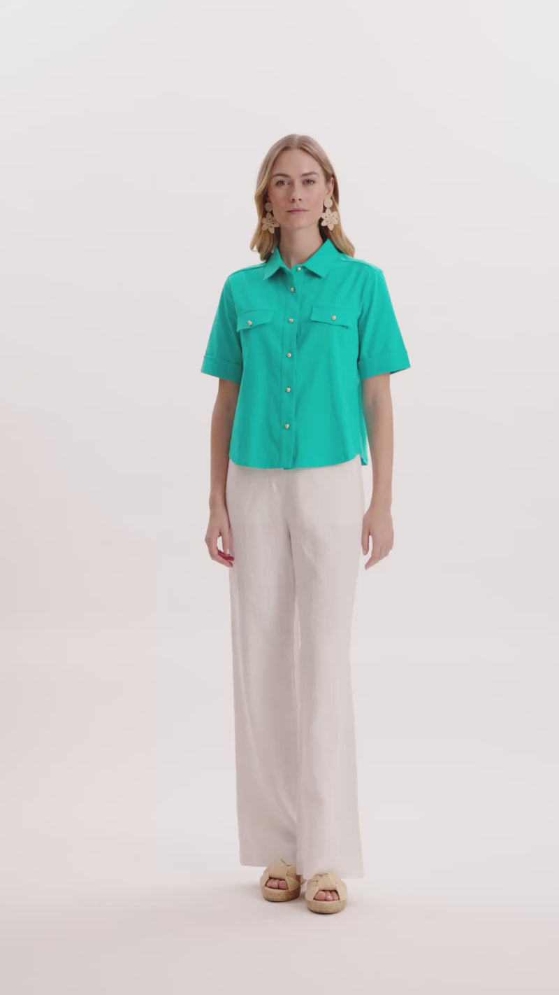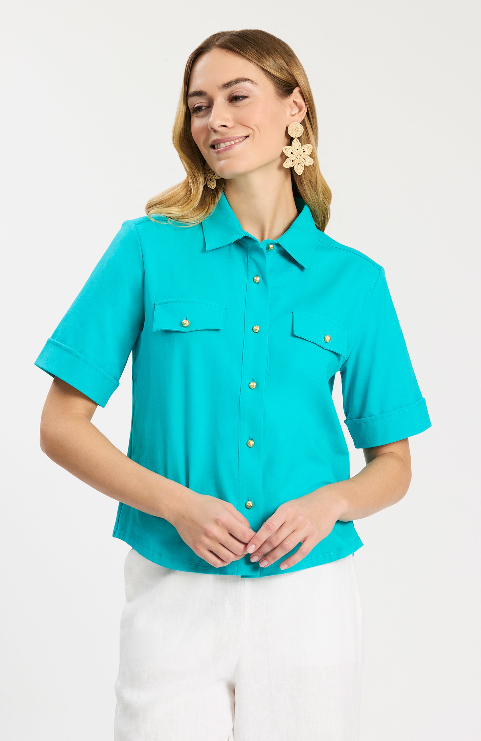 A modern classic you’ll reach for again and again. This short-sleeve button-down is tailored yet effortless, crafted in a comfortable cotton-spandex blend. Chest pockets and gold-tone buttons add a polished finish, while the relaxed silhouette keeps it easy to wear. Perfect for work, weekends, or travel—tucked, untucked, or layered under your favorite jacket.